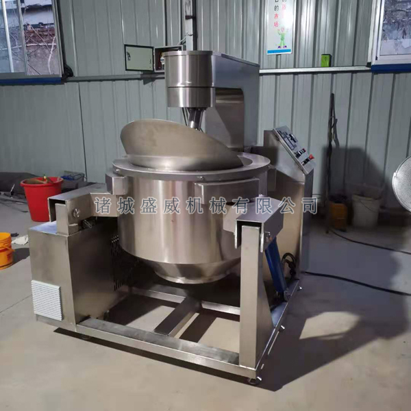 该设备主要由锅体、架体、搅拌系统、加热系统、调速传动装置、搅拌轴、锅体翻转系统等组成,采用一次冲压成型的半球形不锈钢锅体,采用蒸汽、液化气、天然气等加热形式,搅拌方式采用特殊的倾斜式传动,使用的行星式搅拌器与锅体充分接触,实现传动公转与自转的不整数传动比,使锅内无搅拌死角。使用先进的传动与密封结构,使传动部分与锅内洁净、卫生。采用变频调速动力,运行更平稳。采用液压升降,翻锅运料,免拆装搅拌器,大型自动炒菜机节省人力,降低劳动强度,性能优良的食品