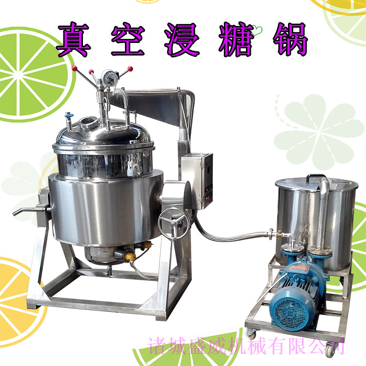 真空浸糖锅又名真空糖渍锅,适用于各种蜜饯、水果浸糖、酱菜迅速腌渍。如:红薯、大枣、蜜枣、山楂、蓝莓、草莓、苹果、梨、桃子等迅速浸糖,酱菜及休闲食品调料迅速腌渍入味,根据产量可配套抽空罐规格,罐体可以加装加温夹层,可安装温度自控系统;可配套气动开盖装置。真空浸糖锅以有压力的蒸汽为热源,真空浸糖锅具有受热面积大、热效率高、加热均匀、沸腾时间短、加热温度容易控制、方便清洗、真空度高等特点。