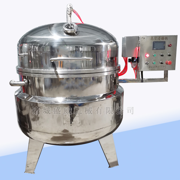 真空浸糖锅又名真空糖渍锅,适用于各种蜜饯、水果浸糖、酱菜迅速腌渍。如:红薯、大枣、蜜枣、山楂、蓝莓、草莓、苹果、梨、桃子等迅速浸糖,酱菜及休闲食品调料迅速腌渍入味,根据产量可配套抽空罐规格,罐体可以加装加温夹层,可安装温度自控系统;可配套气动开盖装置。真空浸糖锅以有压力的蒸汽为热源,真空浸糖锅具有受热面积大、热效率高、加热均匀、沸腾时间短、加热温度容易控制、方便清洗、真空度高等特点。