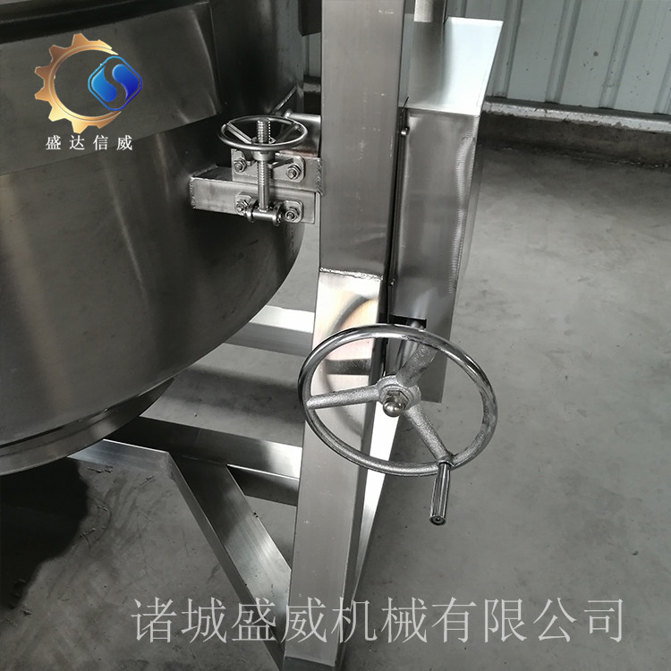 液压升降方式翻转锅体,实现搅拌器与锅体分离后进行液压倾斜倒料,可倾斜90°角,易于清洗,降低劳动强度
